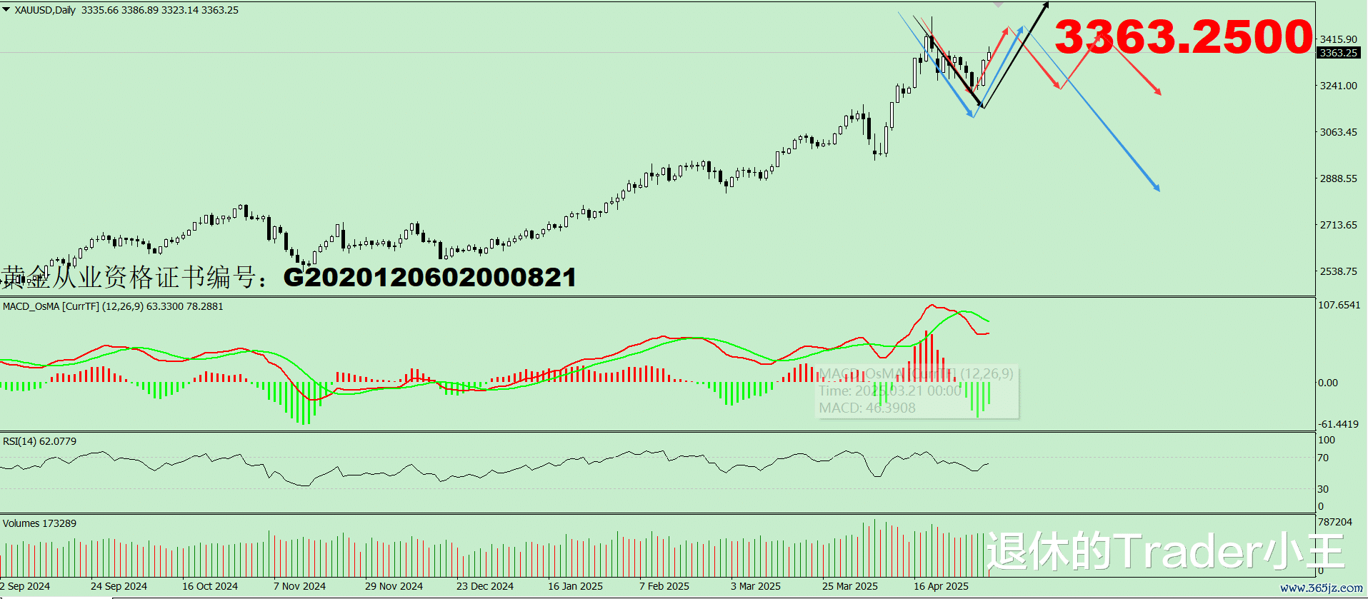 盘面上发生了很大变化,首先来看日线,随着4小时的看跌旗型被破坏,4小时出现底部形态,黄金日线级别的调整是直接回落调整的可能性几乎已经没有了,所以日线接下来的大概情况有三种,第一种就是昨天视频里所说的,日线继续调整,只不过变为高位横盘调整,具体的震荡形态需要继续观察,第二种日线调整结束,就像年后和4月初的行情一样,直接给出新高,第三种的可能较低,也很久没有发生过了,但我还是要说一下,就是反弹不给新高,但是回落跌破3200,走出日线顶部。